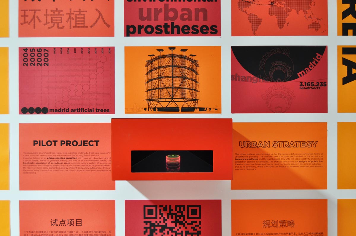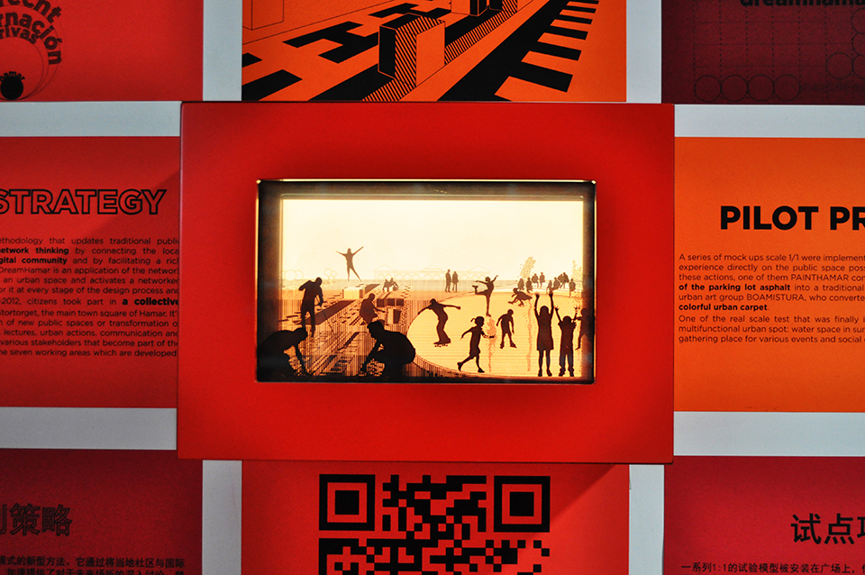 In order to enrich the information display, a digital layer is added to the project narration; 5 multimedia dioramas provide an intriguing representation of the following pilot projects: Exuma Garden of Dreams, Dreamhamar, Asunción Open Lab (Plan Cha), Voronezh Sea Revitalization, and Encarnación Sustainable Development Territorial Plan (Encarnación Más). The other 5 pilot projects presented in Networked Urbanism installation are described throughout short movies displayed as holograms, thanks to a DIY fascinating technique. The videos of the projects Ecoboulevard, Air Tree Shanghai, Ecópolis Plaza, Energy Carousel, Febres Cordero school intervention in Cuenca and Madrid Chair, explain with 3D holograms the complexity of this interventions, showing the different layers and their several possible points of view and configurations.