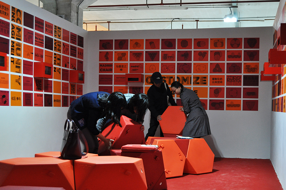 Well centered on the main wall of the space lays the message “Customize public space“, surrounded by drawings of the possible configurations of Madrid Chair. In the central area of the exhibition, there are 18 pieces of this flexible and multipurpose urban furniture in red and orange versions allowing visitors to interact and create their own favorite exhibition layout.